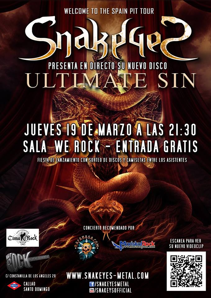 SnakeyeS celebran el lanzamiento de su nuevo disco “Ultmate Sin”, para ello quieren regalaros una gran fiesta en la madrileña sala We Rock, donde darán un concierto muy especial para la ocasión. No puedes perdertelo!! La fecha es el 19 de Marzo a las 21:30 y con entrada gratis.
